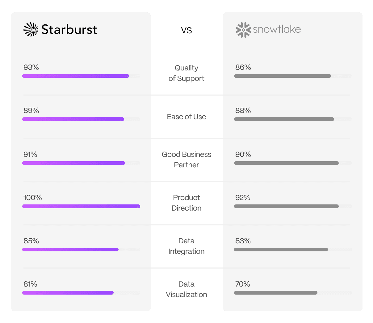 Don’t take our word for it. Starburst is named #1 for Quality of Support and Product Direction in G2’s Enterprise Grid Report based on real customer reviews. Additionally, customers said Starburst beat out Snowflake in all of these categories: